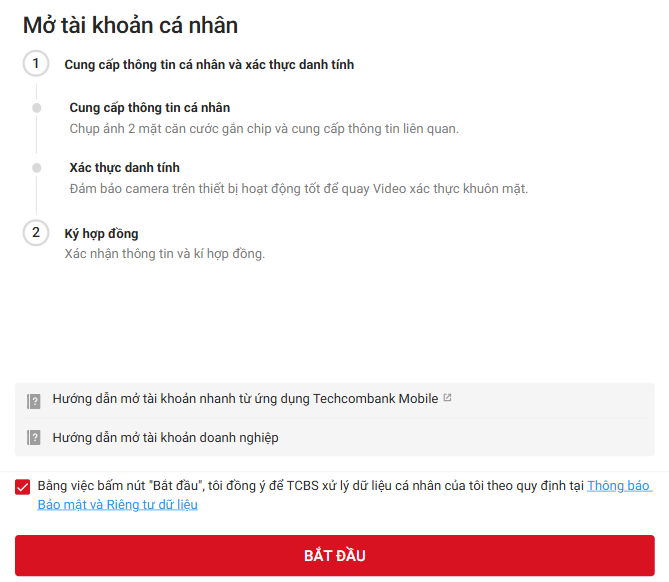 => Tiếp theo bạn chọn “BẮT ĐẦU” để có thể tiến hành mở tài khoản TCBS ngay.