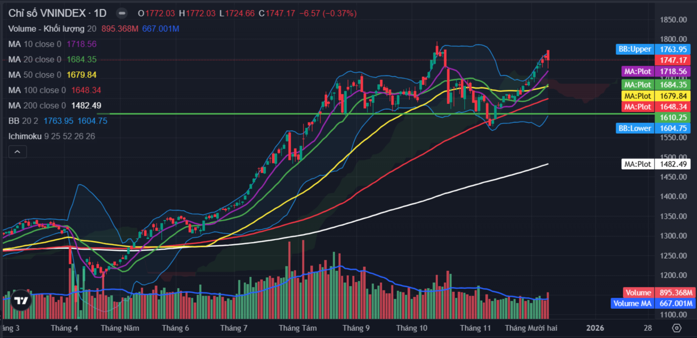 Kết thúc phiên giao dịch ngày 09/12, VN-Index đóng cửa tại 1,747.2 điểm, giảm 6.5 điểm (tương đương 0.4%).Thanh khoản thị trường đạt 952 triệu cổ phiếu khớp lệnh, tương ứng giá trị giao dịch xấp xỉ 27,715 tỷ, tăng mạnh so với phiên trước đó và ở trên trung bình 20 phiên gần nhất.