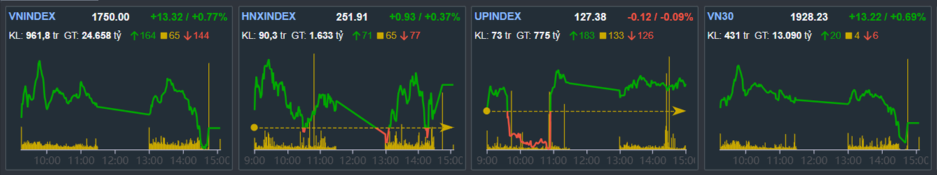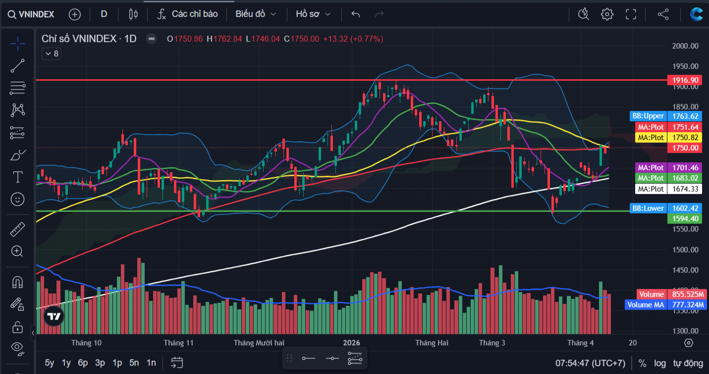 Kết thúc phiên giao dịch ngày 10/04, VN-Index đóng cửa tại 1,750.0 điểm, tăng 13.3 điểm (tương đương 0.8%).Thanh khoản thị trường đạt 954 triệu cổ phiếu khớp lệnh, tương ứng giá trị giao dịch xấp xỉ 24,428 tỷ, giảm với phiên trước đó và ở trên ngưỡng trung bình 20 phiên gần nhất.