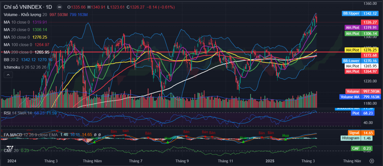 Kết thúc phiên giao dịch ngày 13/03, VN-Index đóng cửa tại 1,326.3 điểm, giảm 8.1 điểm (tương đương 0.6%).Thanh khoản thị trường đạt 1,069 triệu cổ phiếu khớp lệnh, tương ứng giá trị giao dịch xấp xỉ 24,495 tỷ, tăng so với phiên trước đó và nằm ở trên ngưỡng trung bình 20 phiên gần nhất.