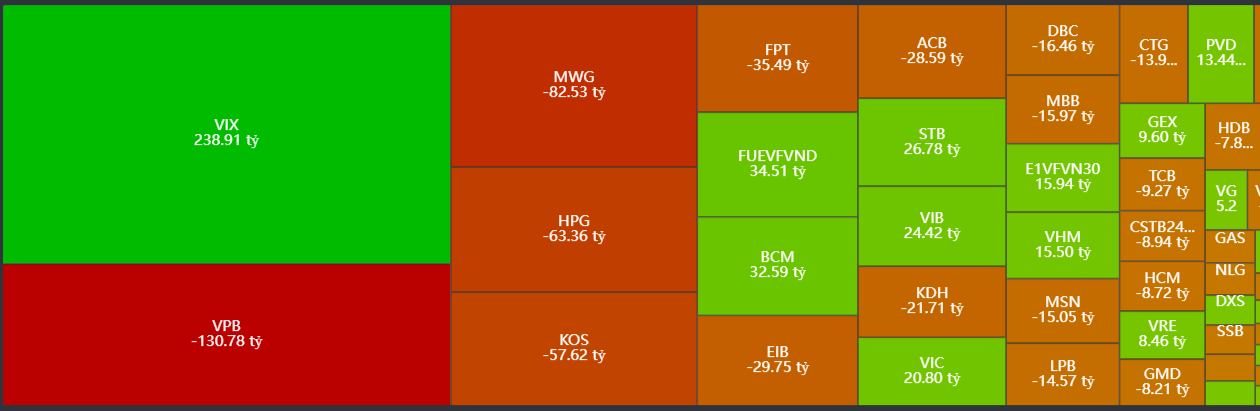 - Bán ròng tập trung: VPB, MWG, HPG, KOS, FPT,…
