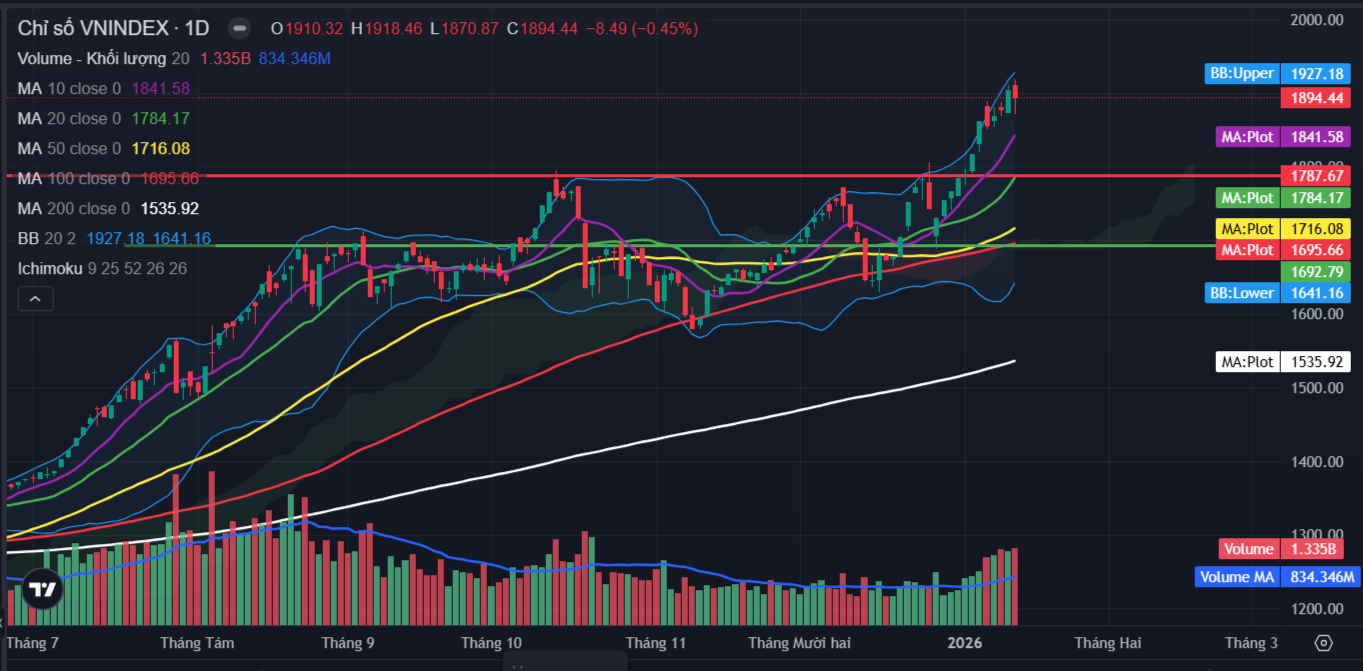 Kết thúc phiên giao dịch ngày 14/01, VN-Index đóng cửa tại 1,894.4 điểm, giảm 8.5 điểm (tương đương 0.4%).Thanh khoản thị trường đạt 1,418 triệu cổ phiếu khớp lệnh, tương ứng giá trị giao dịch xấp xỉ 46,051 tỷ, tăng nhẹ so với phiên trước đó và ở trên ngưỡng trung bình 20 phiên gần nhất.