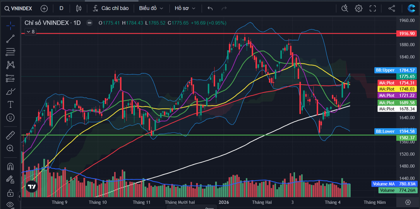 Kết thúc phiên giao dịch ngày 14/04, VN-Index đóng cửa tại 1,775.7 điểm, tăng 16.7 điểm (tương đương 0.9%).Thanh khoản thị trường đạt 853 triệu cổ phiếu khớp lệnh, tương ứng giá trị giao dịch xấp xỉ 22,146 tỷ, tương đương so với phiên trước đó và ở ngưỡng trung bình 20 phiên gần nhất.