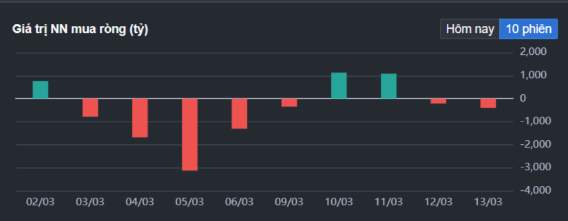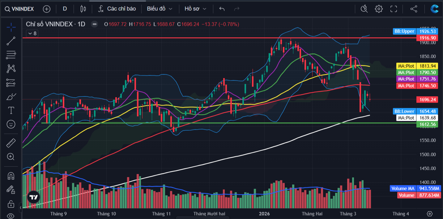 Kết thúc phiên giao dịch ngày 13/03, VN-Index đóng cửa tại 1,696.2 điểm, giảm 13.4 điểm (tương đương 0.8%).Thanh khoản thị trường đạt 1,022 triệu cổ phiếu khớp lệnh, tương ứng giá trị giao dịch xấp xỉ 27,401 tỷ, tăng nhẹ so với phiên trước đó và ở dưới ngưỡng trung bình 20 phiên gần nhất.