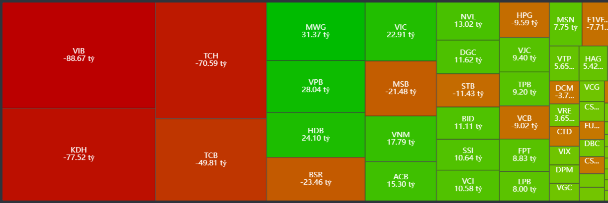- Bán ròng tập trung: VIB, KDH, TCH, TCB, BSR,..