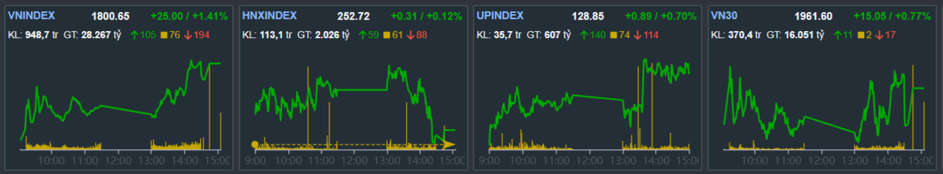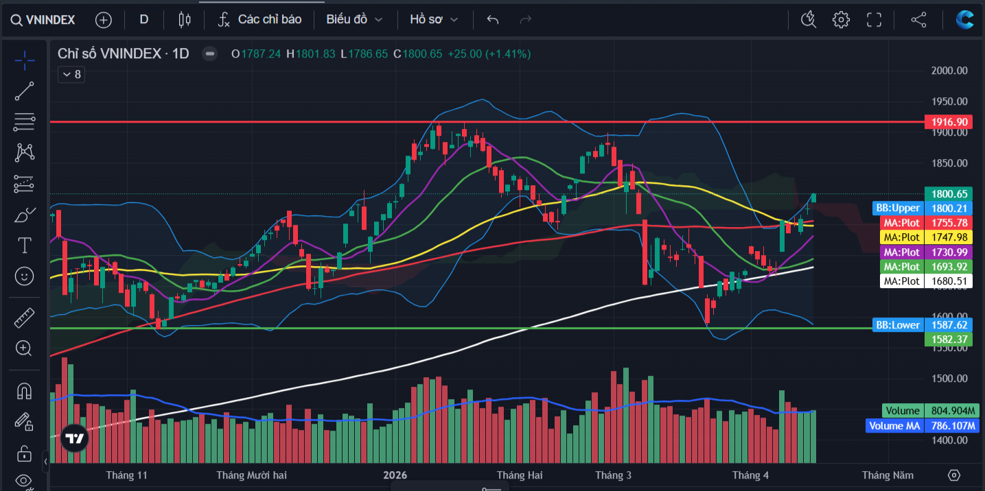 Kết thúc phiên giao dịch ngày 15/04, VN-Index đóng cửa tại 1800.65 điểm, tăng 25 điểm (tương đương 1.41%).Thanh khoản thị trường đạt 948,7 triệu cổ phiếu khớp lệnh, tương ứng giá trị giao dịch xấp xỉ 28.267 tỷ, tăng nhẹ so với phiên trước đó và ở ngưỡng trung bình 20 phiên gần nhất.