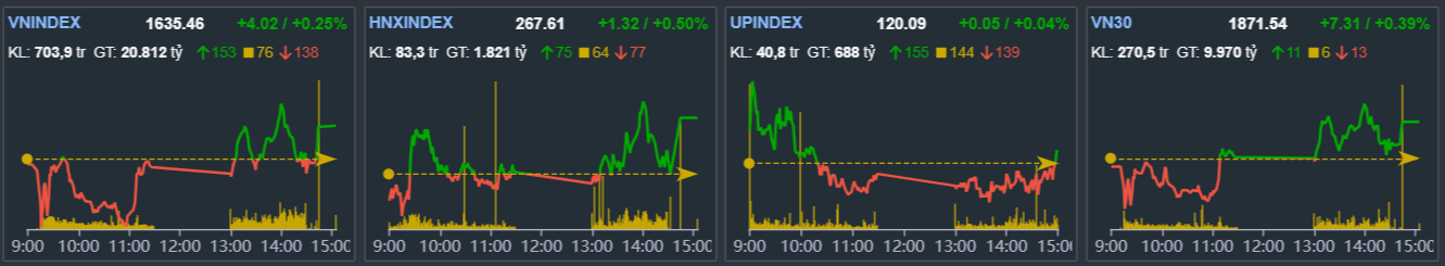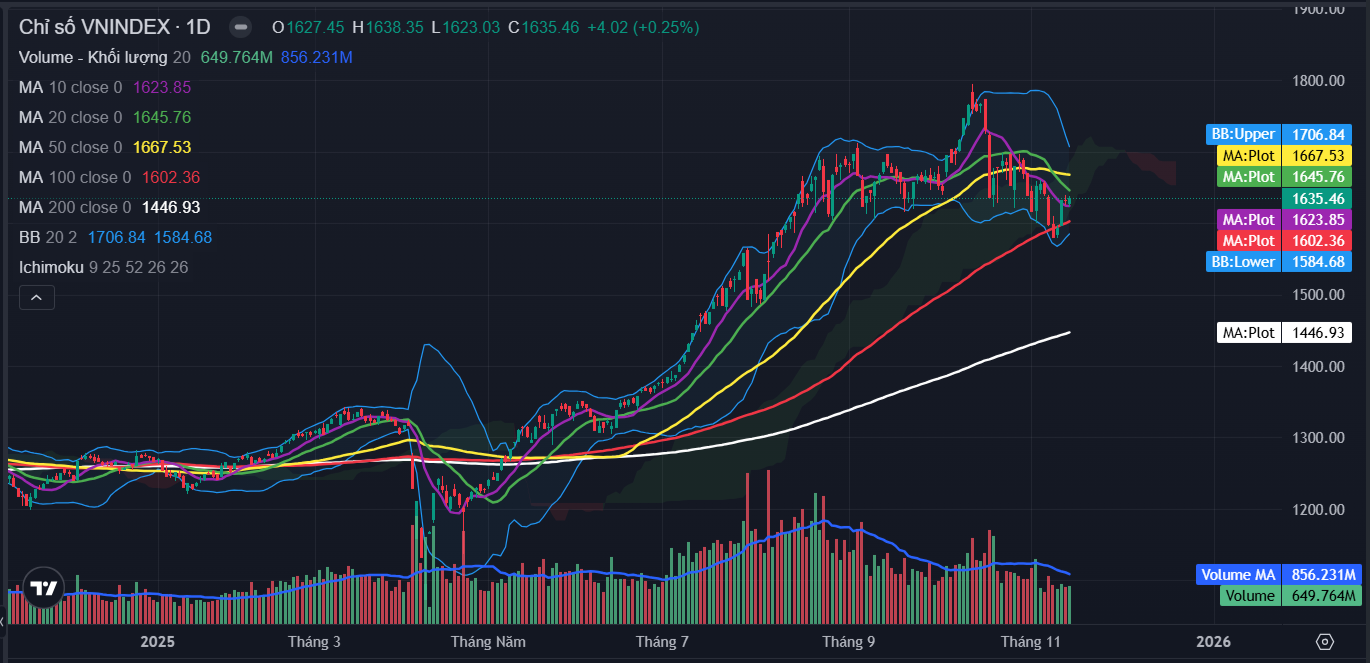 Kết thúc phiên giao dịch ngày 14/11, VN-Index đóng cửa tại 1,635.5 điểm, tăng 4.1 điểm (tương đương 0.2%).Thanh khoản thị trường đạt 699 triệu cổ phiếu khớp lệnh, tương ứng giá trị giao dịch xấp xỉ 20,661 tỷ, tăng nhẹ so với phiên trước đó và dưới ngưỡng trung bình 20 phiên gần nhất.