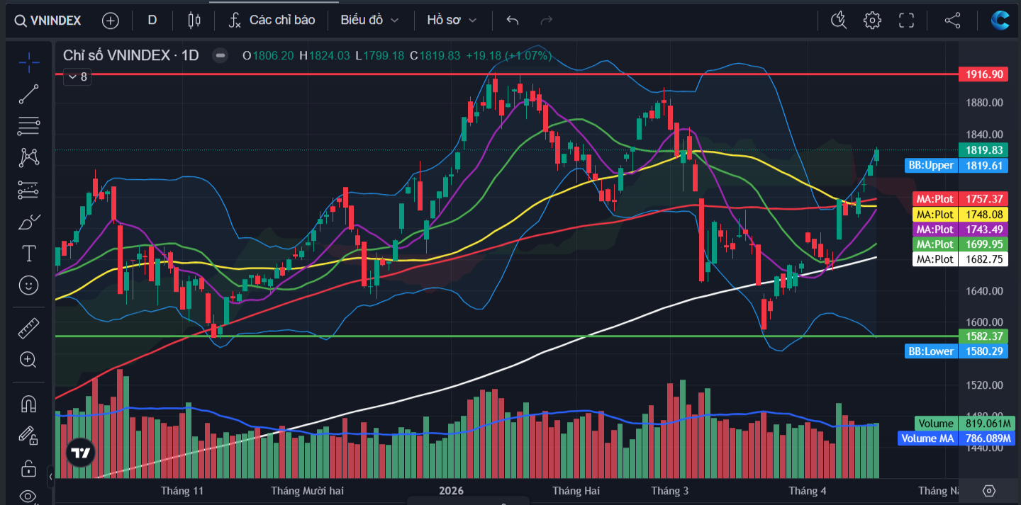 Kết thúc phiên giao dịch ngày 16/04, VN-Index đóng cửa tại 1,819.8 điểm, tăng 19.1 điểm (tương đương 1.1%).Thanh khoản thị trường đạt 999 triệu cổ phiếu khớp lệnh, tương ứng giá trị giao dịch xấp xỉ 27,819 tỷ, tăng nhẹ so với phiên trước đó và ở ngưỡng trung bình 20 phiên gần nhất.