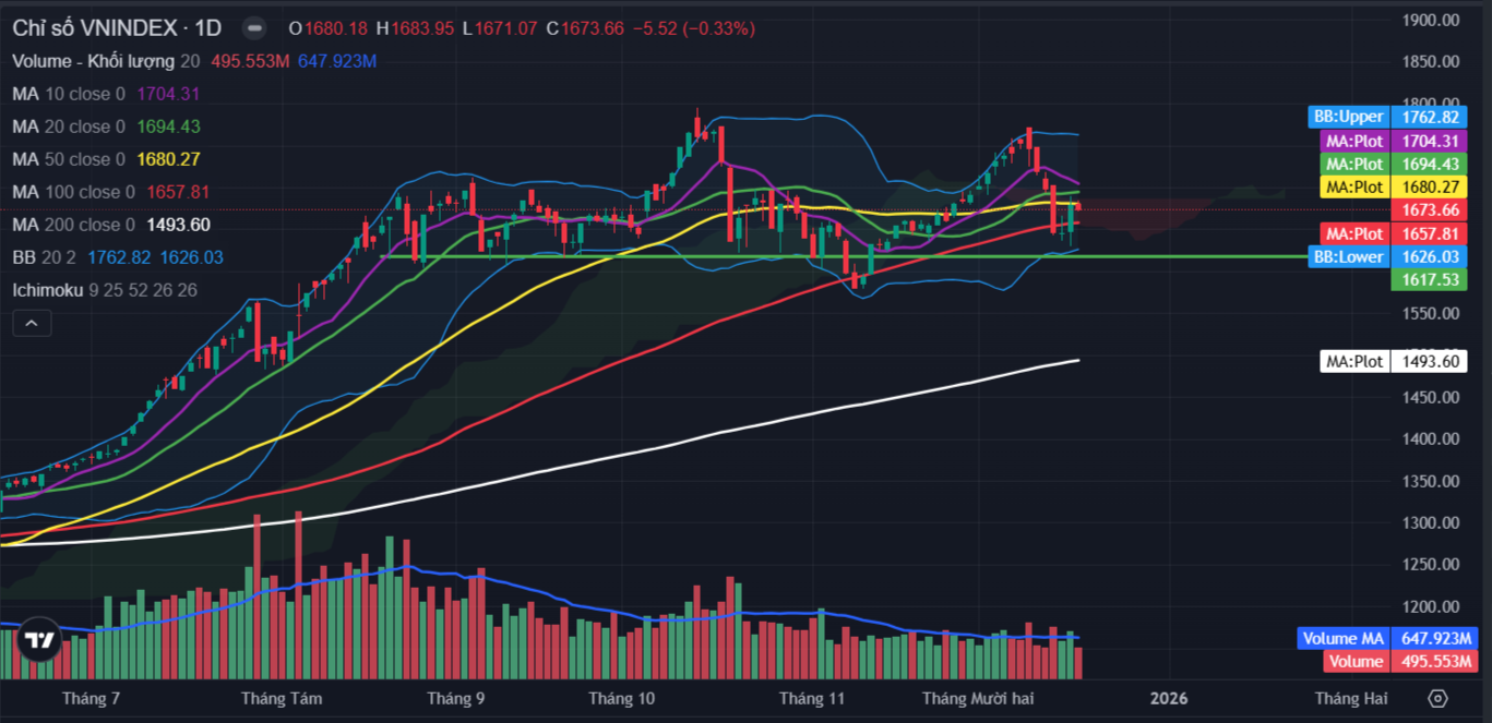 Kết thúc phiên giao dịch ngày 17/12, VN-Index đóng cửa tại 1,673.7 điểm, giảm 5.5 điểm (tương đương 0.3%).Thanh khoản thị trường đạt 607 triệu cổ phiếu khớp lệnh, tương ứng giá trị giao dịch xấp xỉ 19,099 tỷ, giảm so với phiên trước đó và ở dưới ngưỡng trung bình 20 phiên gần nhất.