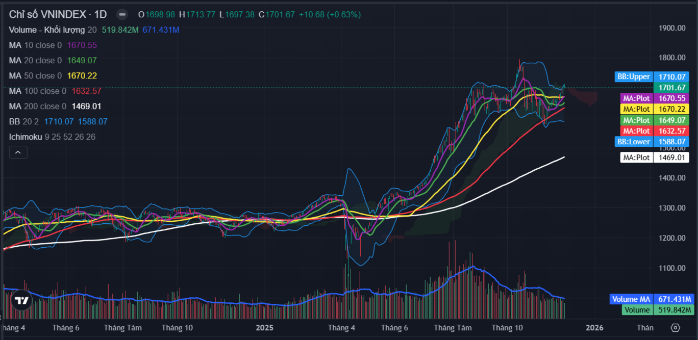 Kết thúc phiên giao dịch ngày 01/12, VN-Index đóng cửa tại 1,701.7 điểm, tăng 10.7 điểm (tương đương 0.6%).Thanh khoản thị trường đạt 613 triệu cổ phiếu khớp lệnh, tương ứng giá trị giao dịch xấp xỉ 18,533 tỷ, giảm so với phiên trước đó và ở dưới ngưỡng trung bình 20 phiên gần nhất.