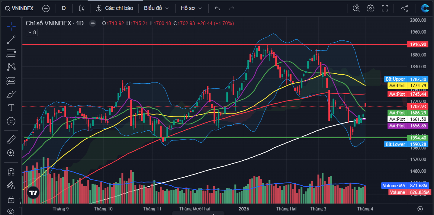 Kết thúc phiên giao dịch ngày 01/04, VN-Index đóng cửa tại 1,702.9 điểm, tăng 28.4 điểm (tương đương 1.7%).Thanh khoản thị trường đạt 932 triệu cổ phiếu khớp lệnh, tương ứng giá trị giao dịch xấp xỉ 28,094 tỷ, tăng nhẹ với phiên trước đó và ở dưới ngưỡng trung bình 20 phiên gần nhất.