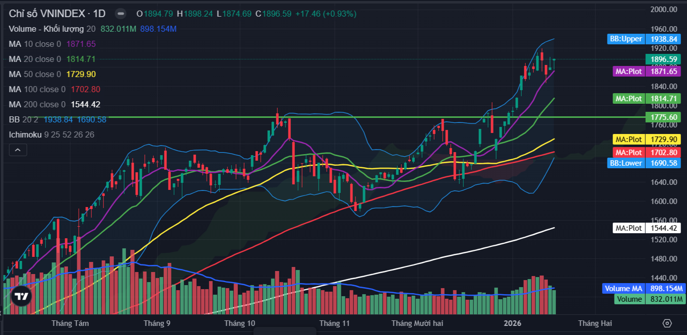 Kết thúc phiên giao dịch ngày 19/01, VN-Index đóng cửa tại 1,896.6 điểm, tăng 17.5 điểm (tương đương 0.9%).Thanh khoản thị trường đạt 1,154 triệu cổ phiếu khớp lệnh, tương ứng giá trị giao dịch xấp xỉ 36,183 tỷ, giảm so với phiên trước đó và ở dưới ngưỡng trung bình 20 phiên gần nhất.