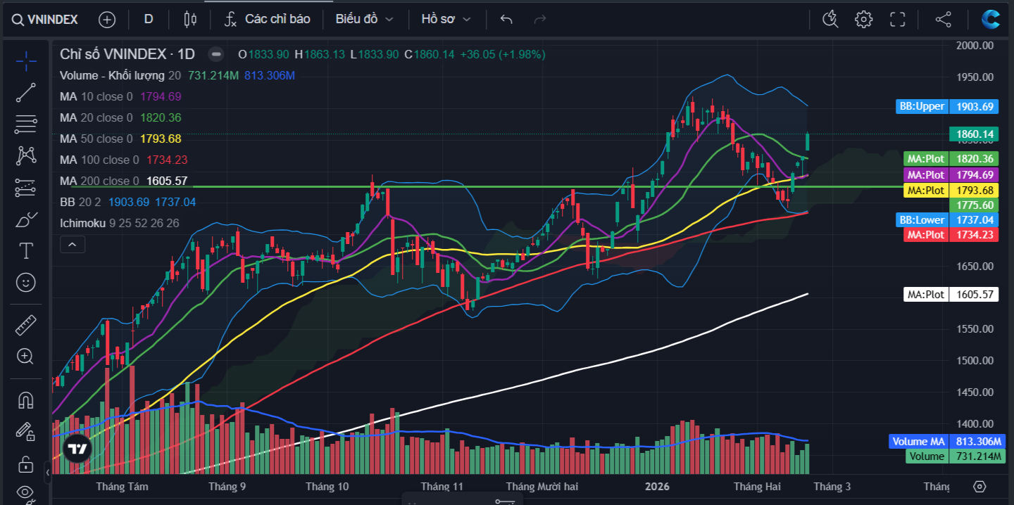 Chỉ số VN-Index ghi nhận phiên tăng điểm mạnh, đóng cửa tại 1.860 điểm, chính thức vượt trở lại vùng kháng cự 1.850 điểm và lấy lại trạng thái tích cực trong ngắn hạn. Dòng tiền lan tỏa trên diện rộng ở hầu hết các nhóm ngành dẫn dắt như Ngân hàng, Bất động sản và Năng lượng. Tuy nhiên, áp lực điều chỉnh cục bộ vẫn hiện hữu tại nhóm Công nghệ. Đáng chú ý, thanh khoản cải thiện nhẹ, song còn ở mức thấp – phản ánh tâm lý thận trọng sau kỳ nghỉ lễ Tết. Dù rằng sẽ có một số rung lắc, điều chỉnh nhẹ, song xu thế chung vẫn sẽ là tăng điểm với mục tiêu là quanh ngưỡng 1.920 điểm.