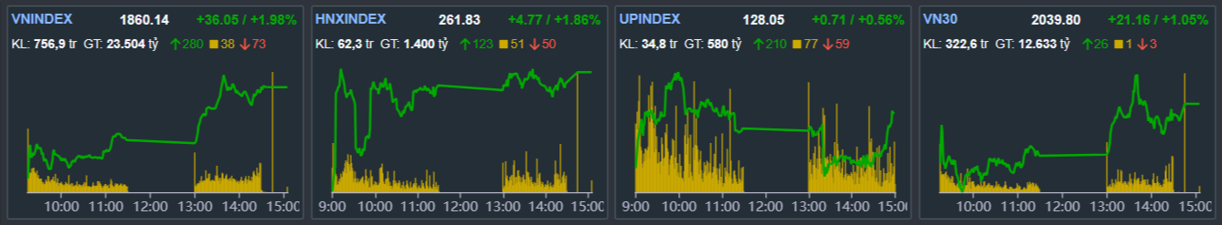 Kết thúc phiên giao dịch ngày 23/02, VN-Index đóng cửa tại 1,860.1 điểm, tăng 36.0 điểm (tương đương 2.0%).Thanh khoản thị trường đạt 755 triệu cổ phiếu khớp lệnh, tương ứng giá trị giao dịch xấp xỉ 23,463 tỷ, tăng so với phiên trước đó và ở dưới ngưỡng trung bình 20 phiên gần nhất.
