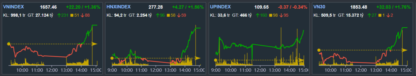 Kết thúc phiên giao dịch ngày 24/09, VN-Index đóng cửa tại 1,657.5 điểm, tăng 22.2 điểm (tương đương 1.4%).Thanh khoản thị trường đạt 990 triệu cổ phiếu khớp lệnh, tương ứng giá trị giao dịch xấp xỉ 26,712 tỷ, tăng so với phiên trước đó và dưới ngưỡng trung bình 20 phiên gần nhất.