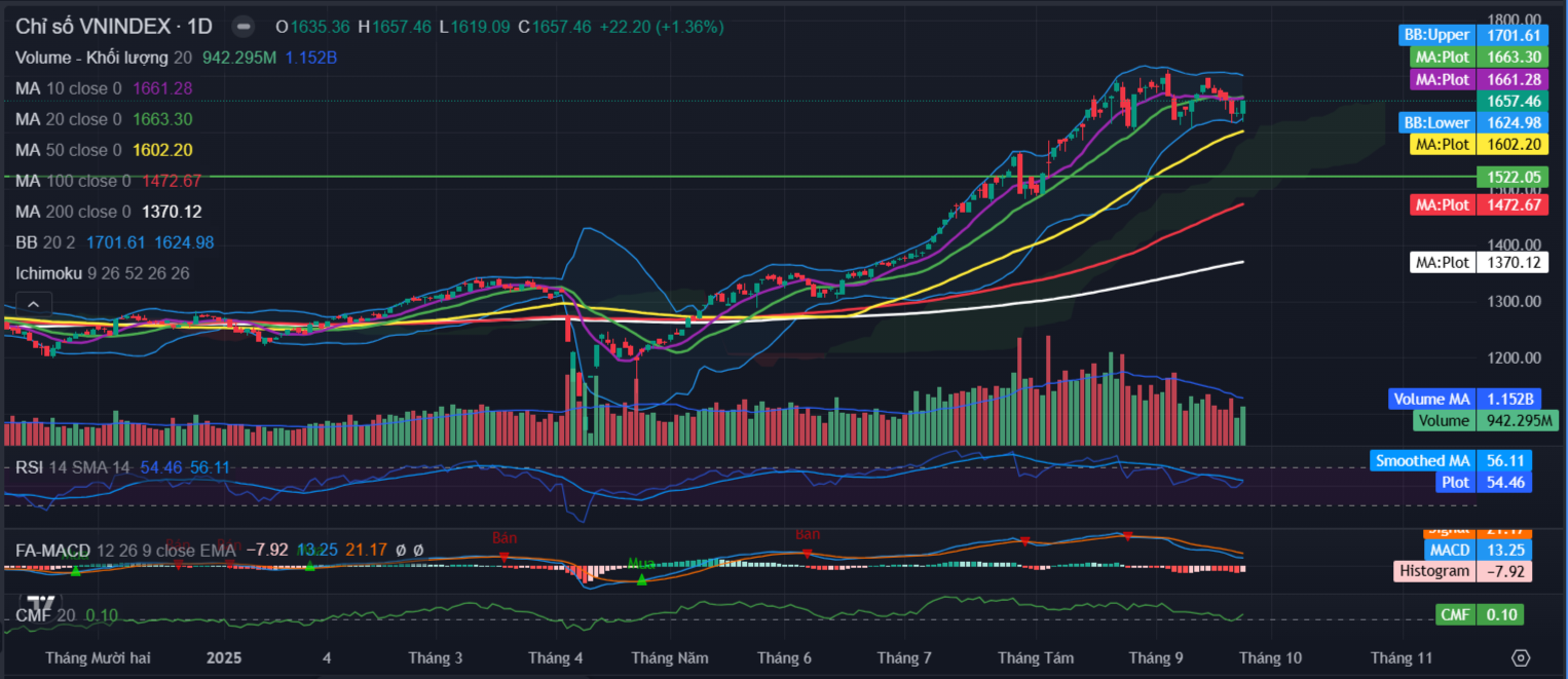 Trên góc nhìn kỹ thuật, Chỉ số VN-Index kết phiên với nến xanh tăng điểm với bóng nến dưới tương đối dài nhờ diễn biến tích cực ở nhóm cổ phiếu vốn hóa lớn. Trên khung đồ thị ngày, chỉ báo RSI đã tạo đáy và đảo chiều hướng lên thể hiện cho lực cầu bắt đáy mạnh mẽ của thị trường. Đồng thời, chỉ báo CMF đảo chiều vượt lên ngưỡng 0 cho thấy dòng tiền mua chủ động đã dần quay trở lại sau những nhịp giảm điểm trước đó. Chỉ số được kỳ vọng tìm lại điểm cân bằng quanh mốc 1.640-1.650 điểm với vùng kháng cự ngắn hạn quanh mốc 1.700 điểm – vùng đỉnh cũ của thị trường. Trên khung đồ thị giờ, chỉ số chung đảo chiều vượt lên mốc hỗ trợ MA20 nhờ thanh khoản mua chủ động gia tăng cuối phiên chiều. Trong khi chỉ báo MACD đã tạo đáy xác nhận xu hướng hồi phục của VN-Index.