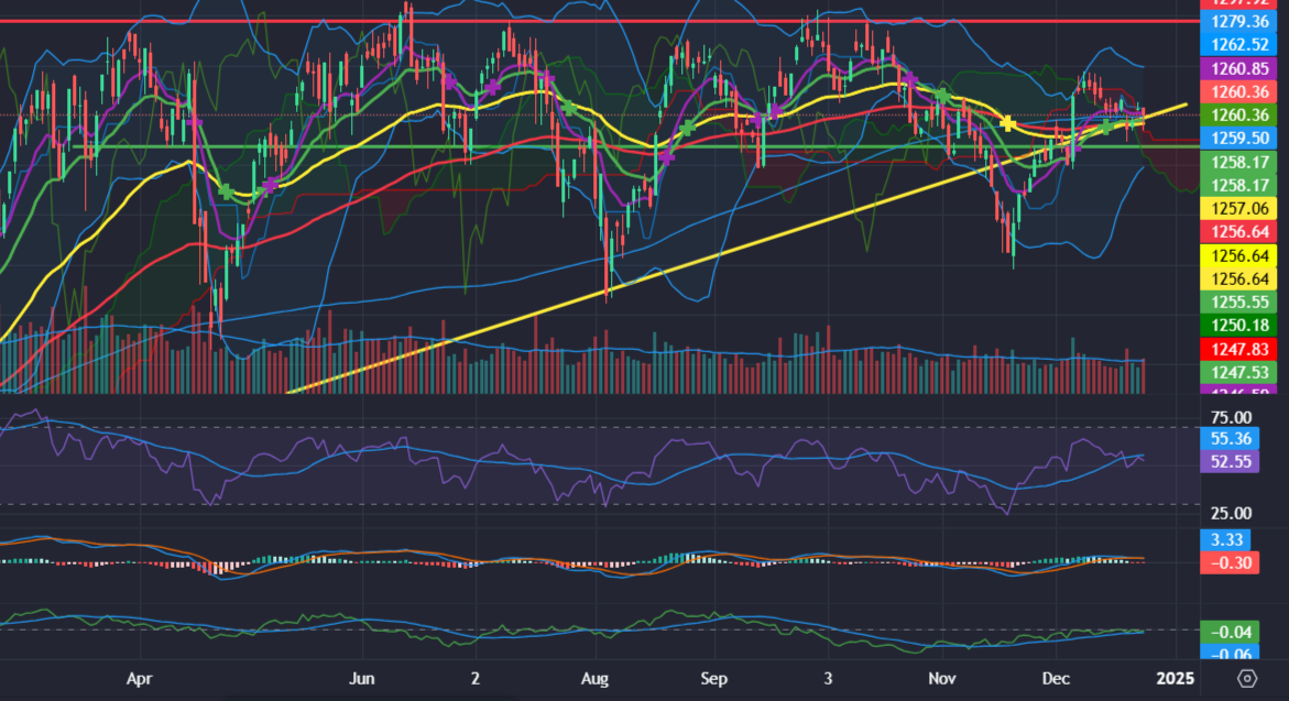 Dù đà tăng thu hẹp một phần khi kết phiên, song đây vẫn là một tín hiệu rất tích cực của thị trường cho thấy dòng tiền đang có chiều hướng quay trở lại sau phiên bùng nổ (05/12/2024) trước đó. Thị trường, sau phiên hôm qua đang kỳ vọng vào xu hướng tăng mới để lần lượt kiểm tra lại vùng giá 1.280-1.300 điểm. Đây vẫn là vùng kháng cự rất mạnh, vùng đỉnh các tháng 03-07/2024 và 9-10/2024 từ đầu năm đến nay.