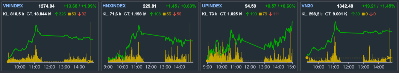 Kết thúc phiên giao dịch ngày 25/12, VN-Index đóng cửa tại 1,274.0 điểm, tăng 13.6 điểm (tương đương 1.1%).Thanh khoản thị trường đạt 810 triệu cổ phiếu khớp lệnh, tương ứng giá trị giao dịch xấp xỉ 18,844 tỷ, tăng mạnh so với phiên trước đó xấp xỉ 15,973 tỷ và nằm trên ngưỡng trung bình 20 phiên gần nhất.