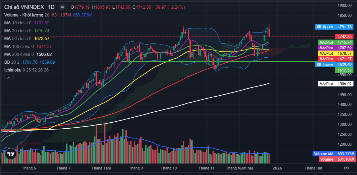 Kết thúc phiên giao dịch ngày 25/12, VN-Index đóng cửa tại 1,742.8 điểm, giảm 40.0 điểm (tương đương 2.2%).Thanh khoản thị trường đạt 804 triệu cổ phiếu khớp lệnh, tương ứng giá trị giao dịch xấp xỉ 25,087 tỷ, giảm nhẹ so với phiên trước đó và ở ngưỡng trung bình 20 phiên gần nhất.