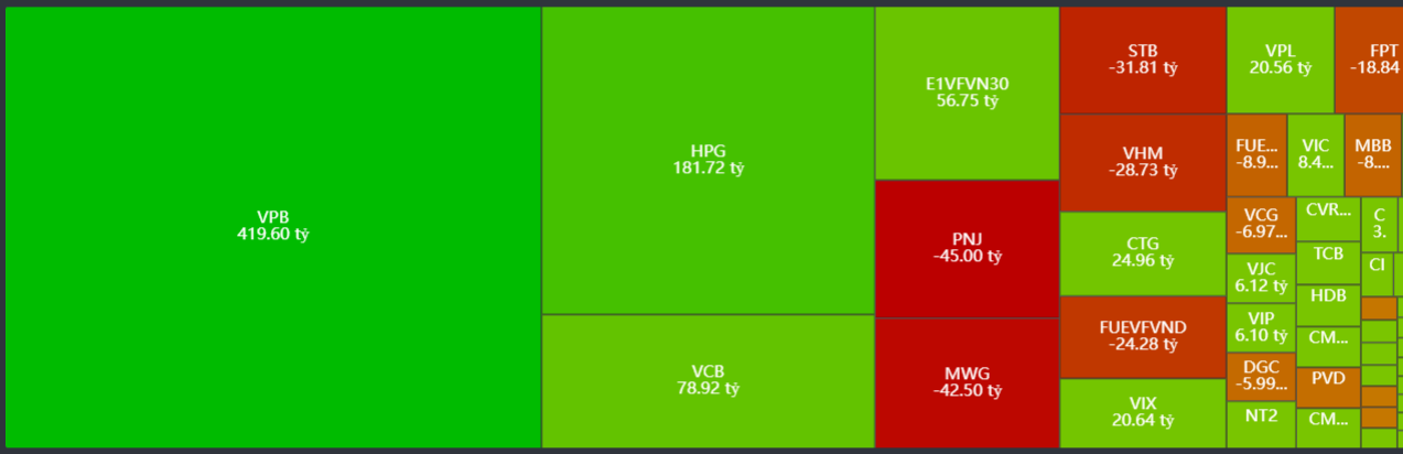 - Mua ròng tập trung: VPB, HPG, VCB, E1VFVN30, CTG,..