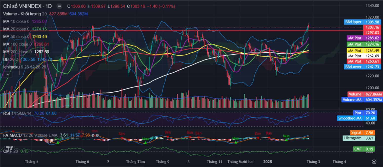 Kết thúc phiên giao dịch ngày 25/02, VN-Index đóng cửa tại 1,303.2 điểm, giảm 1.4 điểm (tương đương 0.1%).Thanh khoản thị trường đạt 886 triệu cổ phiếu khớp lệnh, tương ứng giá trị giao dịch xấp xỉ 19,568 tỷ, tăng so với phiên trước đó và ở trên ngưỡng trung bình 20 phiên gần nhất.