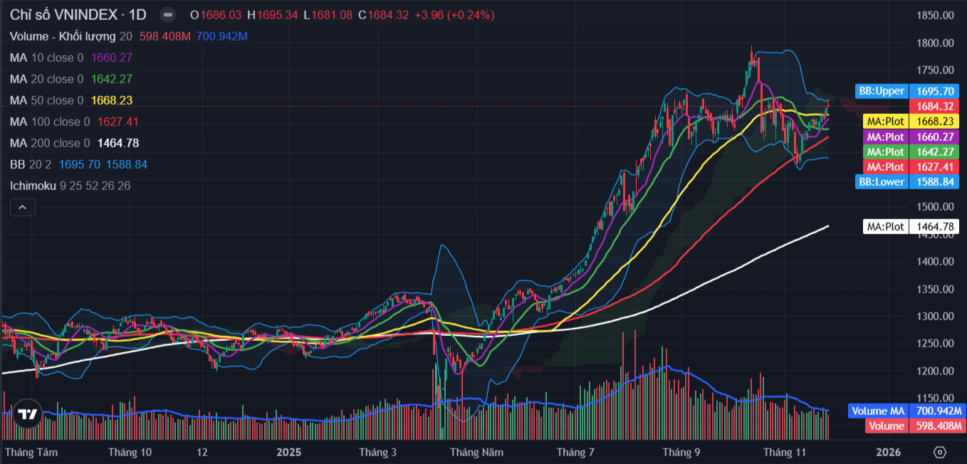 Kết thúc phiên giao dịch ngày 27/11, VN-Index đóng cửa tại 1,684.3 điểm, tăng 3.9 điểm (tương đương 0.2%).Thanh khoản thị trường đạt 702 triệu cổ phiếu khớp lệnh, tương ứng giá trị giao dịch xấp xỉ 20,590 tỷ, giảm so với phiên trước đó và ở dưới ngưỡng trung bình 20 phiên gần nhất.