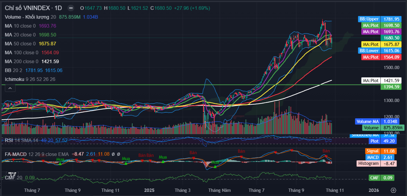 Trên góc nhìn kỹ thuật, Chỉ số VN-Index kết phiên sáng trong sắc đỏ, chiều tăng mạnh 27,96 điểm, tương đương 1,69% lên trên 1.680 điểm. Ở khung đồ thị giờ, VN-Index hình thành mô hình hai đáy, cùng chỉ báo RSI hướng lên và MACD tạo phân kỳ dương, cho thấy đà hồi phục có thể tiếp diễn trong những phiên tới. Ở khung đồ thị ngày, chỉ số V-Index tạo cây nến xanh rút chân tăng mạnh với biên độ rộng 27 điểm, sau khi về kiểm định lực cung quanh 1.630 điểm. Chỉ số lấy lại mốc MA50 tại 1.675 điểm, chỉ báo CMF = 0,09 hướng lên đều thể hiện dòng tiền có xu hướng quay trở lại thị trường mạnh mẽ hơn.
