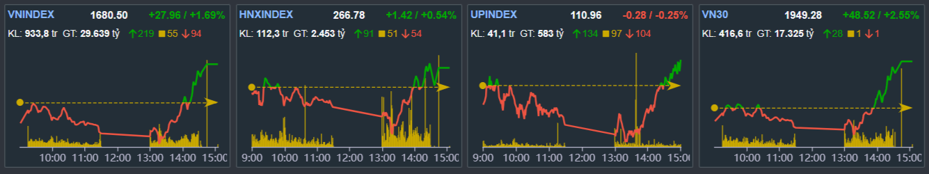 Kết thúc phiên giao dịch ngày 28/10, VN-Index đóng cửa tại 1,680.5 điểm, tăng 28.0 điểm (tương đương 1.7%).Thanh khoản thị trường đạt 932 triệu cổ phiếu khớp lệnh, tương ứng giá trị giao dịch xấp xỉ 29,576 tỷ, giảm nhẹ so với phiên trước đó và ở dưới ngưỡng trung bình 20 phiên gần nhất.