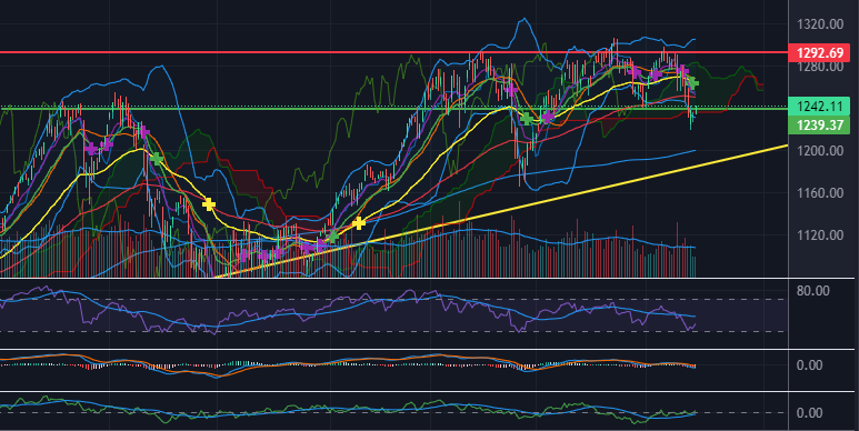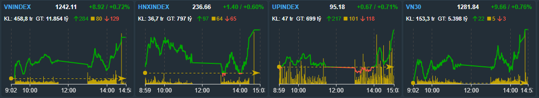 - Khung đồ thị giờ: VN-Index đã giao cắt với đường MA20, đường MACD cắt lên đường chỉ báo, và chỉ báo RSI đang hướng lên, củng cố nhịp phục hồi của thị trường.