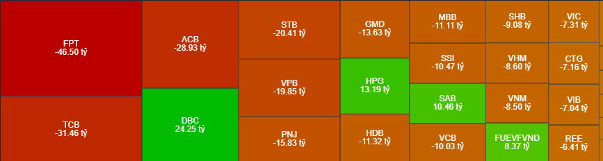 - Bán ròng tập trung: FPT, TCB, ACB, STB, VPB