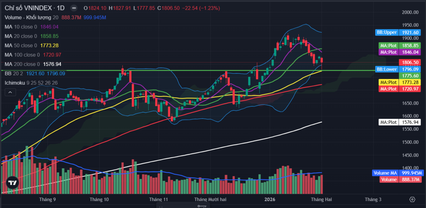 Chỉ số VN-Index giảm mạnh và đóng cửa quanh vùng hỗ trợ 1.800 điểm, cho thấy thị trường vẫn đang trong trạng thái điều chỉnh sau nhịp hồi ngắn trước đó. Trong những phiên tới, chỉ số nhiều khả năng tiếp tục rung lắc quanh vùng 1.800-1.815 điểm. Mốc 1.800 điểm vẫn là hỗ trợ quan trọng cần được giữ vững. Trường hợp đánh mất 1800 điểm, vùng hỗ trợ gần nhất sẽ lùi về 1.770-1.775 điểm (đường xu thế trung hạn MA50 ngày)