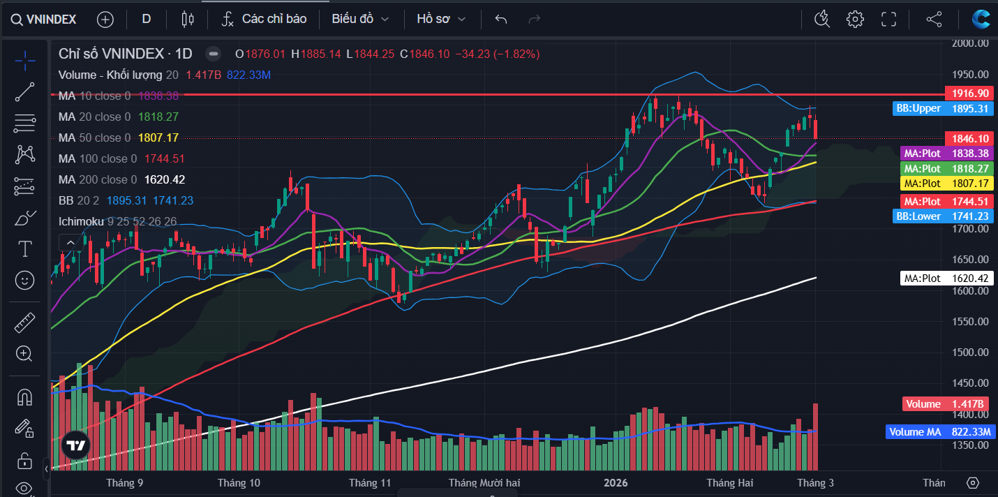 Kết thúc phiên giao dịch ngày 02/03, VN-Index đóng cửa tại 1,846.1 điểm, giảm 34.2 điểm (tương đương 1.8%).Thanh khoản thị trường đạt 1,534 triệu cổ phiếu khớp lệnh, tương ứng giá trị giao dịch xấp xỉ 46,530 tỷ, tăng mạnh so với phiên trước đó và ở trên ngưỡng trung bình 20 phiên gần nhất.