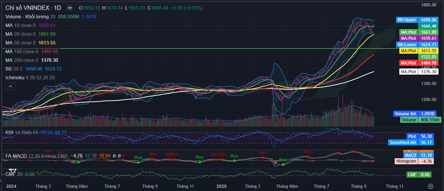 Trên góc nhìn kỹ thuật, Chỉ số VN-Index kết thúc phiên giao dịch với nến xanh cùng bóng trên dài, phản ánh sự giằng co mạnh giữa bên mua và bên bán. Trên khung đồ thị giờ, RSI và MACD gần như đi ngang, cho thấy VN-Index đang trong giai đoạn kiểm tra lực cầu quanh vùng 1.660 điểm. Tuy nhiên, chỉ báo CMF ở mức 0,13 và đang hướng xuống, phản ánh dòng tiền chủ động vẫn khá thận trọng trước diễn biến hiện tại. Vùng hỗ trợ ngắn hạn hiện nằm quanh đường MA20 (tương ứng khoảng 1.650-1.660 điểm). Trên khung đồ thị ngày, chỉ báo RSI tiếp tục hướng lên, cho thấy chỉ số vẫn duy trì xu hướng tăng. Tuy nhiên, ADX vẫn nằm dưới mốc 25 và chưa đồng thuận rõ ràng với đường +DI, trong khi dòng tiền mua chủ động chưa đủ mạnh để tạo sự thuyết phục. Do đó, VN-Index nhiều khả năng cần thêm thời gian tích lũy để củng cố động lực cho một nhịp tăng bền vững hơn.
