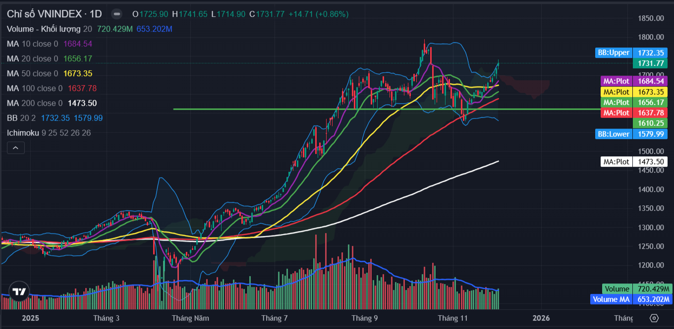 Kết thúc phiên giao dịch ngày 03/12, VN-Index đóng cửa tại 1,731.8 điểm, tăng 14.7 điểm (tương đương 0.9%).Thanh khoản thị trường đạt 783 triệu cổ phiếu khớp lệnh, tương ứng giá trị giao dịch xấp xỉ 24,332 tỷ, tăng so với phiên trước đó và ở trên ngưỡng trung bình 20 phiên gần nhất.
