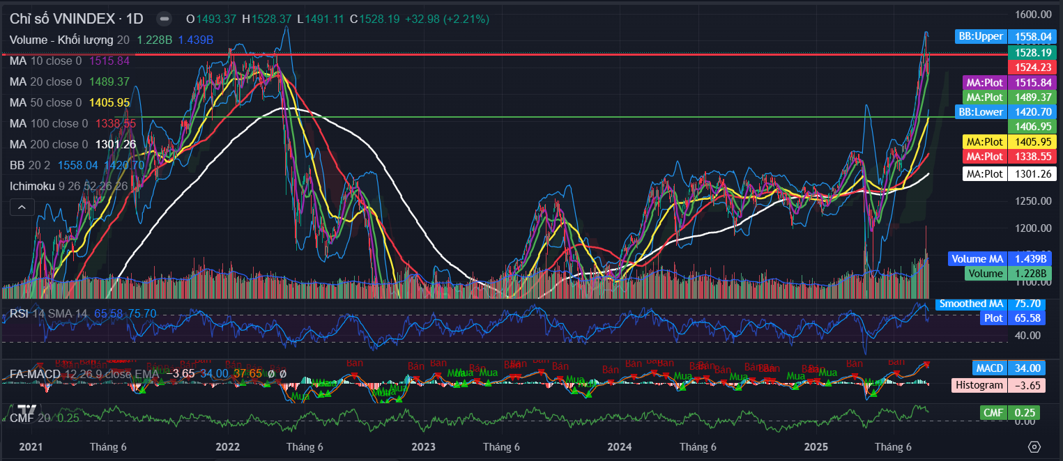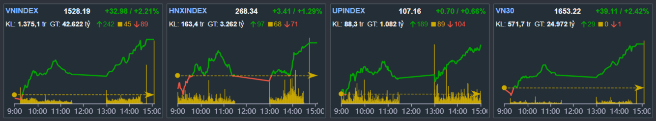 Kết thúc phiên giao dịch ngày 04/08, VN-Index đóng cửa tại 1,528.2 điểm, tăng 33.0 điểm (tương đương 2.2%).Thanh khoản thị trường đạt 1,281 triệu cổ phiếu khớp lệnh, tương ứng giá trị giao dịch xấp xỉ 32,639 tỷ, giảm so với phiên trước đó và ở dưới ngưỡng trung bình 20 phiên gần nhất.