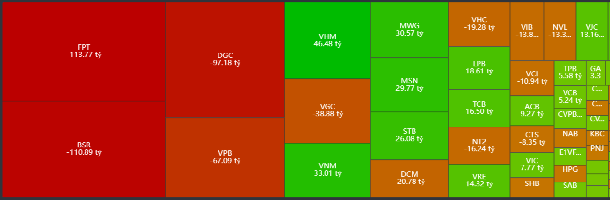 - Bán ròng tập trung: FPT, BSR, DGC, VPB, VGC,..