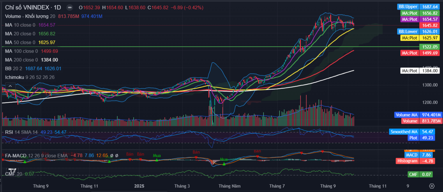 Nhận định phiên tới, VN-Index giảm điểm hai phiên liên tiếp sau giai đoạn đi ngang trước đó, hình thành nên quán tính giảm trong thời gian tới. Do đó, khả năng các nỗ lực hồi phục trong phiên tiếp theo sẽ gặp cản trở quanh kháng cự 1.655-1.660 điểm và chỉ số sẽ duy trì đà giảm về vùng 1.620 điểm.
