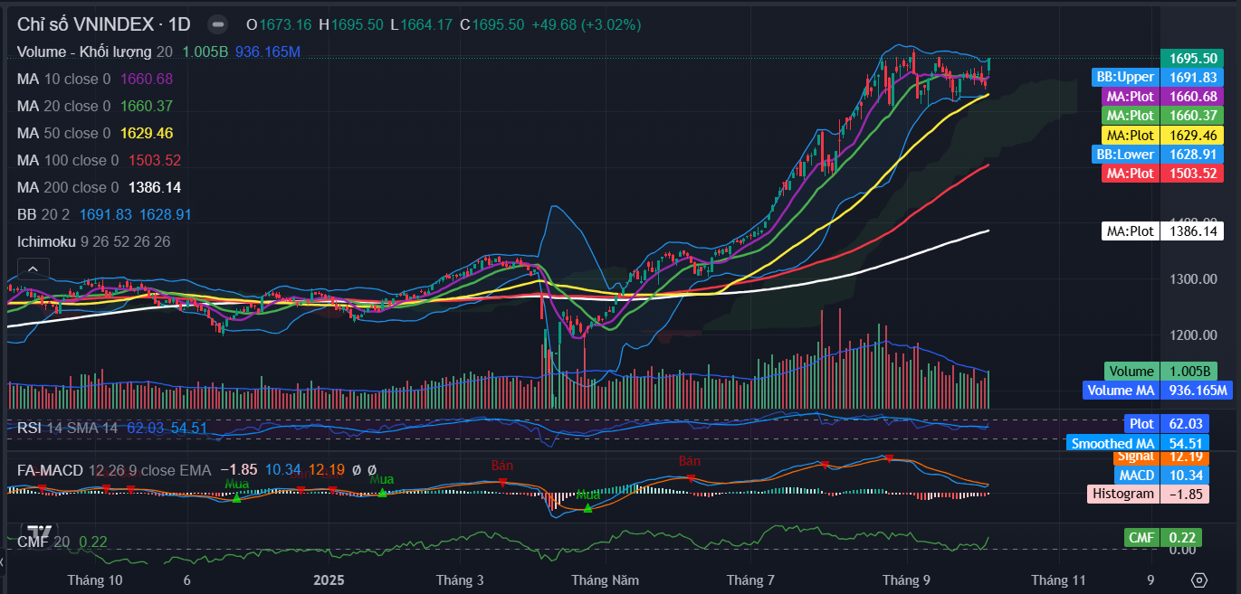 Kết thúc phiên giao dịch ngày 06/10, VN-Index đóng cửa tại 1,695.5 điểm, tăng 49.7 điểm (tương đương 3.0%).Thanh khoản thị trường đạt 1,080 triệu cổ phiếu khớp lệnh, tương ứng giá trị giao dịch xấp xỉ 31,785 tỷ, tăng mạnh so với phiên trước đó và ở ngưỡng trung bình 20 phiên gần nhất.