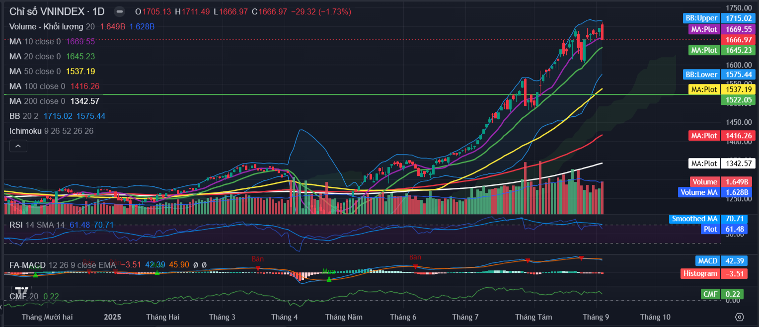 Kết thúc phiên giao dịch ngày 05/09, VN-Index đóng cửa tại 1,667.0 điểm, giảm 29.3 điểm (tương đương 1.7%).Thanh khoản thị trường đạt 1,690 triệu cổ phiếu khớp lệnh, tương ứng giá trị giao dịch xấp xỉ 48,820 tỷ, tăng so với phiên trước đó và ở ngưỡng trung bình 20 phiên gần nhất.