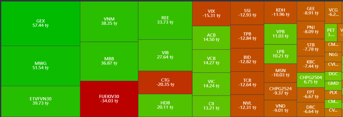 - Mua ròng tập trung: GEX, MWG, E1VFVN30, VNM, MBB…