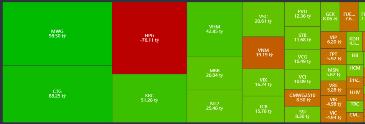 - Mua ròng tập trung: MWG, CTG, KBC, VHM, MBB,..