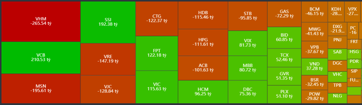 - Bán ròng tập trung: VHM, MSN, VRE, VJC, CTG,…