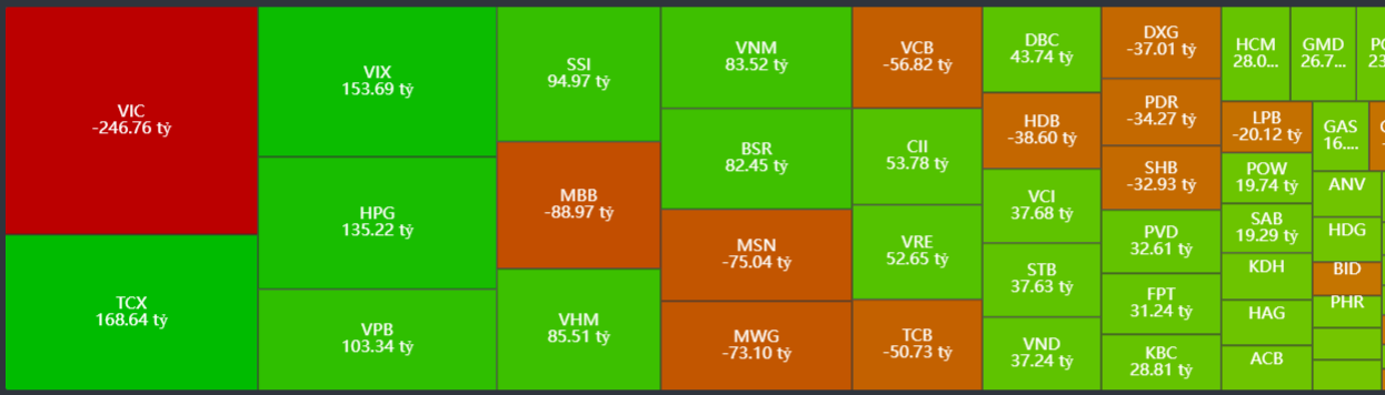 - Bán ròng tập trung: VIC, MBB, MSN, MWG, TCB,…