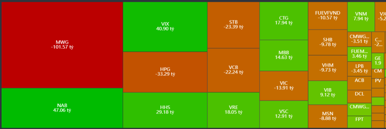 - Bán ròng tập trung: MWG, HPG, STB, VCB, VIC,..