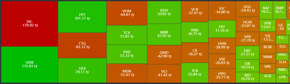 - Bán ròng tập trung: VIC, CTG, VHM, MSN, GMD,…