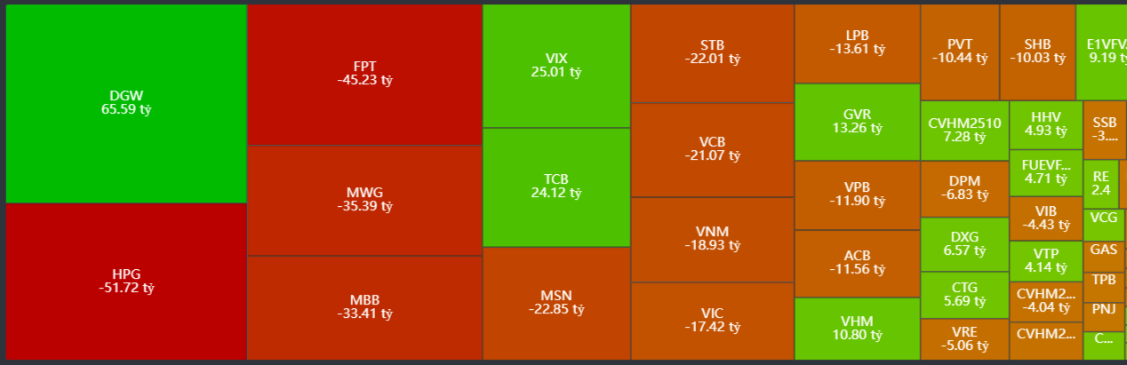 - Bán ròng tập trung: HPG, FPT, MWG, MBB, MSN…
