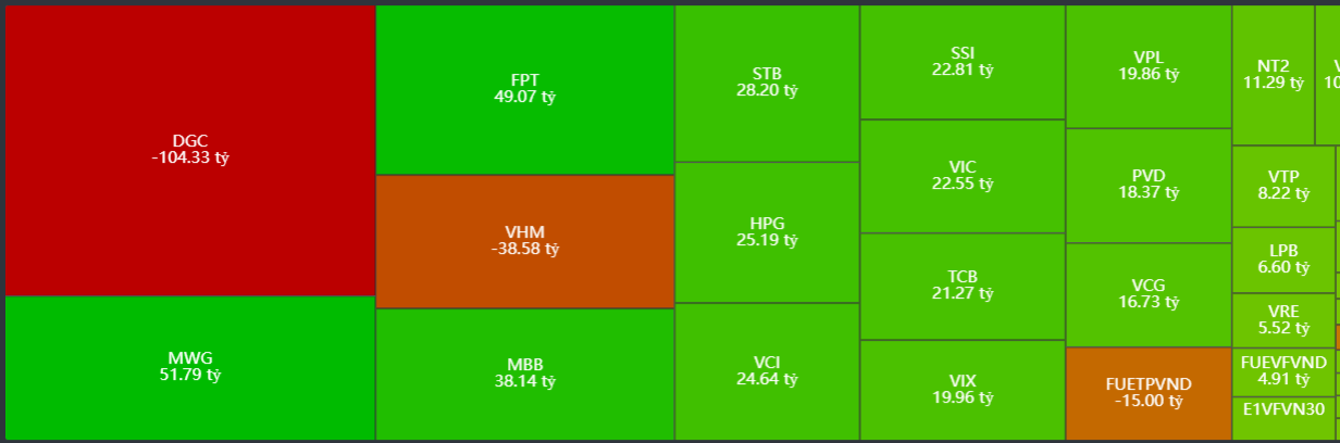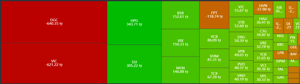 - Bán ròng tập trung: DGC, VIC, FPT, HVN, DGW,…
