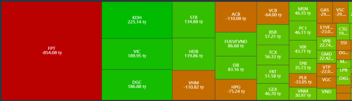 - Bán ròng tập trung: FPT, VHM, ACB, HPG, VCB,…