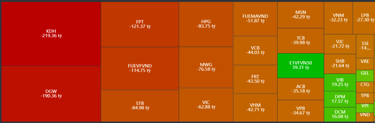 - Bán ròng tập trung: KDH, DGW, FPT, FUEVFVND, STB,..\