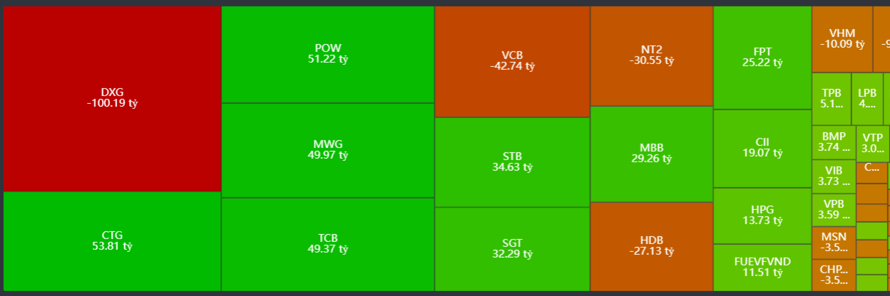 - Bán ròng tập trung: DXG, VCB, NT2, HDB, VHM,..